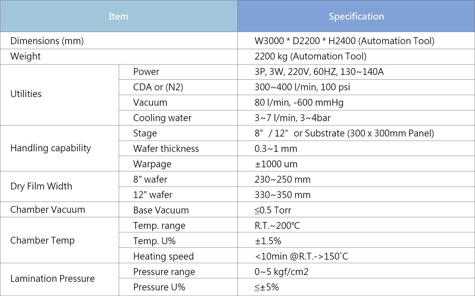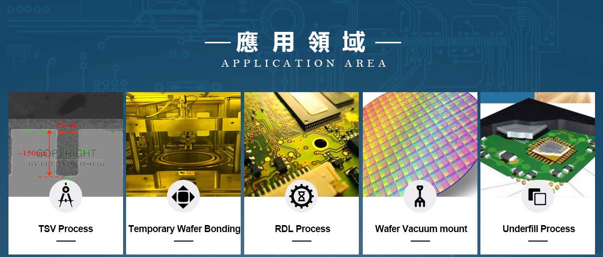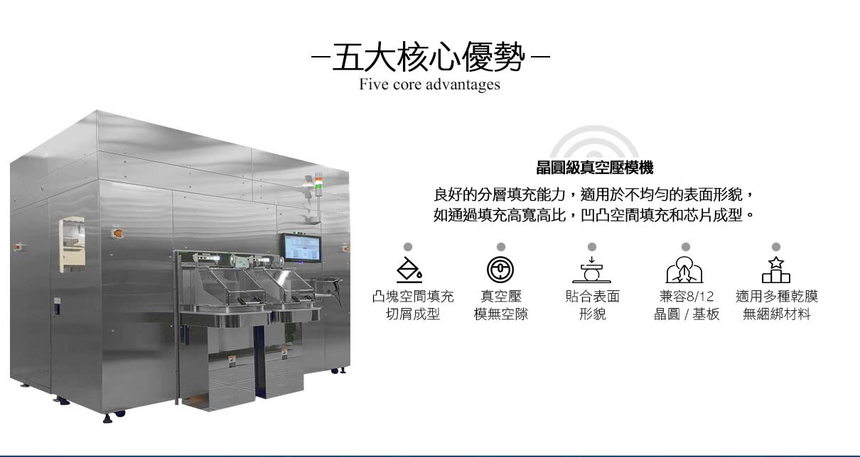 毅力科技晶圓級真空貼壓膜機,有別於傳統使用滾輪式的貼膜機,創新真空下貼附乾膜,獨家開發軟墊式加熱氣囊壓合,真空 / 壓力 / 溫度 可獨立設置符合材料應用,可擴充壓膜腔體進行二次表面整平壓合。貼壓膜前,欲貼合的乾膜與晶圓在腔體內保持一段間距不接觸,待腔體抽真空後,軟性氣囊再進行貼壓膜,如此更可避免先預貼膜再真空壓膜方式而產生氣泡或是乾膜填覆不佳的問題。本真空貼壓膜機特別適合晶圓表面具有凹凸起伏結構圖案的貼壓膜製程,如:Flip Chip製程的NCF壓膜、Fan-out製程的Mold film壓膜以及3D-IC製程所需的TSV填孔……,可實現完美無氣泡及高深寬比填覆的貼壓膜(特殊專利設計, 業界最高經驗 1:20 深寬比對應)。設備已完成全自動量產,可適用對接 8” & 12”晶圓工藝。
